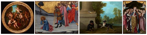 Images (left to right): Charles-Antoine Coypel, The Blacksmith Cupids (Les Amours Forgerons), c. 1715-1720, oil on canvas, Dallas Museum of Art, Foundation for the Arts Collection, gift of Mr. and Mrs. Thomas C. Campbell; Gregorio di Cecco di Luca, The Martyrdom of an early Christian Saint, c. 1418-1424, egg tempera on panel, collection of Suzanne Deal Booth and David Booth; Jean–Baptiste Oudry, Dogs playing with birds in a park, 1754, oil on canvas, private collection; The Master of the Legend of Saint Barbara, Saint Ursula Protecting the Eleven Thousand Virgins with her Cloak, c. 1470-1500, oil on panel, collection of Suzanne Deal Booth and David Booth