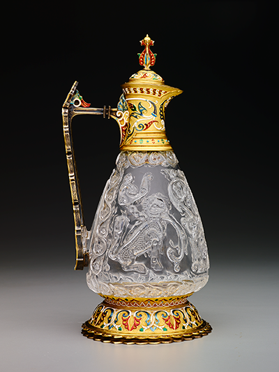 Images (left to right): Rock crystal ewer, Egypt, late 10th–11th century, Fatimid, mounts by Jean-Valentin Morel, Sèvres (France), 1854, rock crystal with enameled gold mounts, The Keir Collection of Islamic Art on loan to the Dallas Museum of Art; Rock crystal ewer (detail), Egypt, late 10th–11th century, Fatimid, mounts by Jean-Valentin Morel, Sèvres (France), 1854, rock crystal with enameled gold mounts, The Keir Collection of Islamic Art on loan to the Dallas Museum of Art