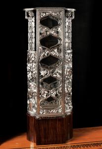 In the 1990s, the Museum continued developing these holdings through the acquisition of the Stephen Vaughan Collection of 19th-century flatware, the 1889 Belmont-Rothschild humidor by Tiffany and the Oberod Collection of Martelé by Gorham, later adding the unique Martelé dressing table made for the Paris Exposition of 1900 and several other exposition-related works including a unique “Viking” vase made by Tiffany & Co. in 1901. In 2002, the DMA acquired the most important private collection of American 20th-century manufactured silver: the Jewel Stern American Silver Collection. In addition, the museum has recently acquired several important works of late 19th- and 20th-century European silver, including a silver trophy cup by English designer Charles Robert Ashbee, a silver and opal box by Archibald Knox, and a silver and malachite centerpiece by Wiener Werkstätte designer Josef Hoffmann.